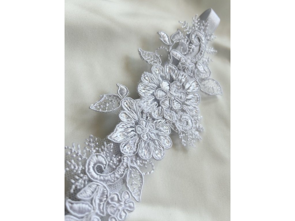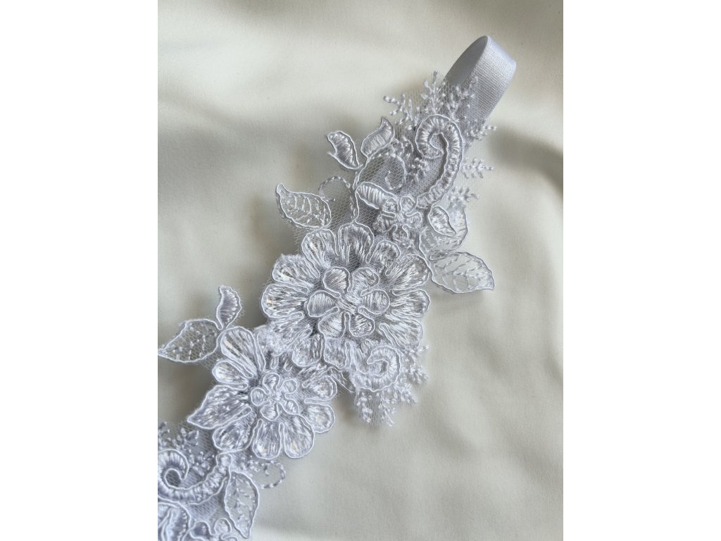 Podvazek je vytvořený z krásné vyšívané krajky v bílé barvě. Pruženka je díky posunovacímu kolečku vhodná pro jakoukoli velikost. Nevěsta si tak může podvazek umístit přesně tam, kde jí vyhovuje.